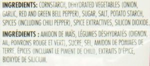 Cornstarch, dehydrated vegetables (onion, garlic, green bell pepper, red bell pepper), sugar, salt, spices (including red pepper), spice extractives, silicon dioxide.