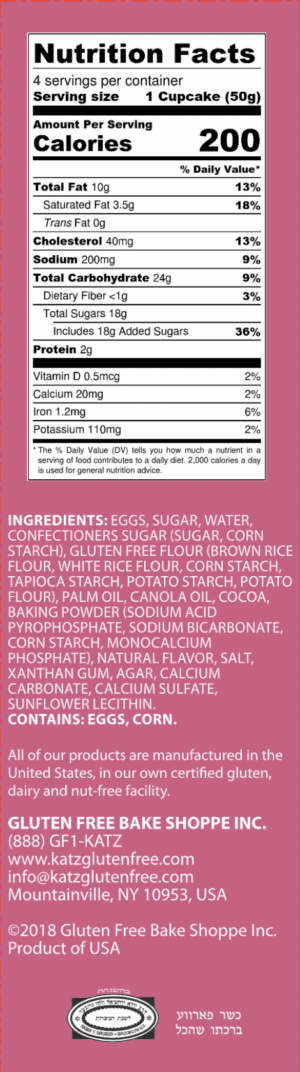 Ingredients: Eggs, Sugar, Water, Confectioners Sugar (Sugar, Corn Starch), Gluten Free Flour (Brown Rice Flour, White Rice Flour, Corn Starch, Tapioca Starch, Potato Starch, Potato Flour), Palm Oil, Canola Oil, Cocoa, Baking Powder (Sodium Acid Pyrophosphate, Sodium Bicarbonate, Corn Starch, Monocalcium Phosphate), Natural Flavor, Salt, Xanthan Gum, Agar, Calcium Carbonate, Calcium Sulfate, Sunflower Lecithin.
