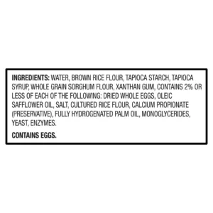 Water, Brown Rice Flour, Tapioca Starch, Tapioca Syrup, Whole Grain Sorghum Flour, Xanthan Gum, Contains 2% or less of Each of The Following: Whole Eggs, Extra Virgin Olive Oil, Salt, Cultured Rice Flour, Calcium Propionate (Mold Inhibitor), Fully Hydrogenated Palm Oil, Monoglycerides, Yeast, Enzymes.