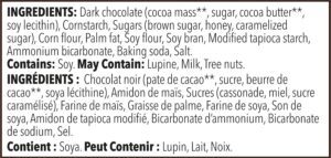 Dark chocolate (cocoa mass, sugar, cocoa butter, soy lecithin), corn starch, brown sugar, corn flour, palm fat, soy flour, soy bran, honey, modified tapioca starch, ammonium bicarbonate, baking soda, salt, caramelized sugar.