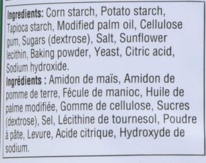 Cornstarch, potato starch, tapioca starch, palm oil, dextrose, cellulose gum, baking powder, salt, citric acid, yeast, soy lecithin, sodium hydroxide.
