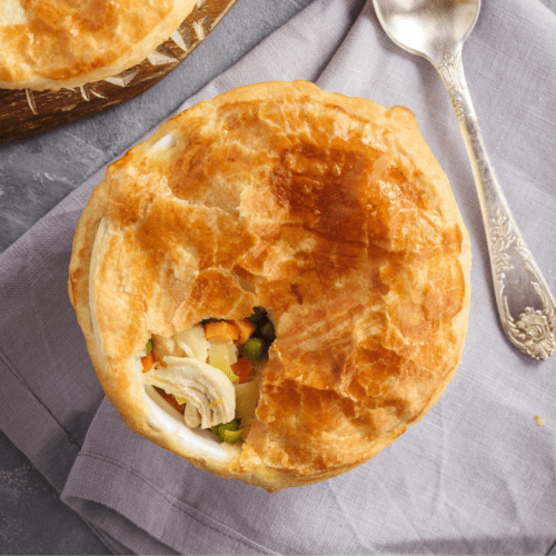 Using a gluten free puff pastry instead of a top pie crust (keep the bottom pie crust or skip) is possible. However, keep in mind that the underside of the dough may end up tasting soggy. Biscuits are another great alternative to using a pie crust for a chicken pot pie. When using gluten free biscuits, skip the bottom pie crust and use the biscuit topping only.